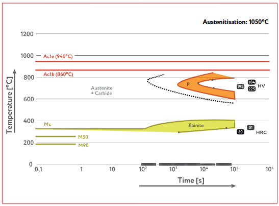 | Tempering | In the range 550 – 600°C for at least 3 h according to hardness requirements and conditions of use. Tempering must be repeated a second time at a temperature equal to or 20°C lower than the previous. Before tempering, the parts must be preheated to 200 – 300°C | Air | Usual service hardness: 44-52 HRC | ||