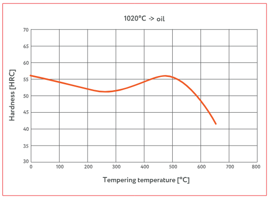 | Hardening | Preheating to 350-400°C Second preheating to 750-850°C Heat to hardening temperature to 1000-1020°C | Min. H.T. for 1 minute /mm | Air or pressure gas by vacuum | Quenched hardness 52-56HRC | |