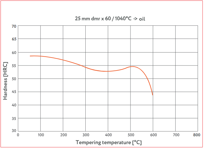 | Tempering | Heat to 170 – 270°C | Min. H.T. for 3 minute /mm | Air | To be carried out soon after the hardening according to the required hardness; at 170 – 270°C in order to match hardness and resistance to corrosion; permanence for at least 2 hours; tempering must be repeated at least twice at a temperature 30°C lower than the previous | |