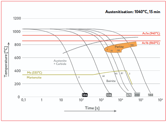 | Hardening | Preheating to 350-400°C Second preheating to 750-850°C Heat to hardening temperature to 1000-1020°C | Min. H.T. for 1 minute /mm | Air or pressure gas by vacuum | Quenched hardness 52-56HRC | |